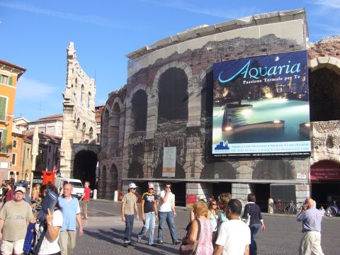 アレーナ(ローマ時代の野外の円形劇場)で、毎年夏、オペラが開かれ、この時期にはヨーロッパ各国からそれを鑑賞するためにやってくることでも知られている町です。写真上左はジュリエッタ家のバルコニー。「おー!あなたはどうしてロミオなの?」と思わず叫びたくなるようなバルコニー。でも、「ロミオとジュリエット」の原作はシェークスピアじゃなかったですよね?
